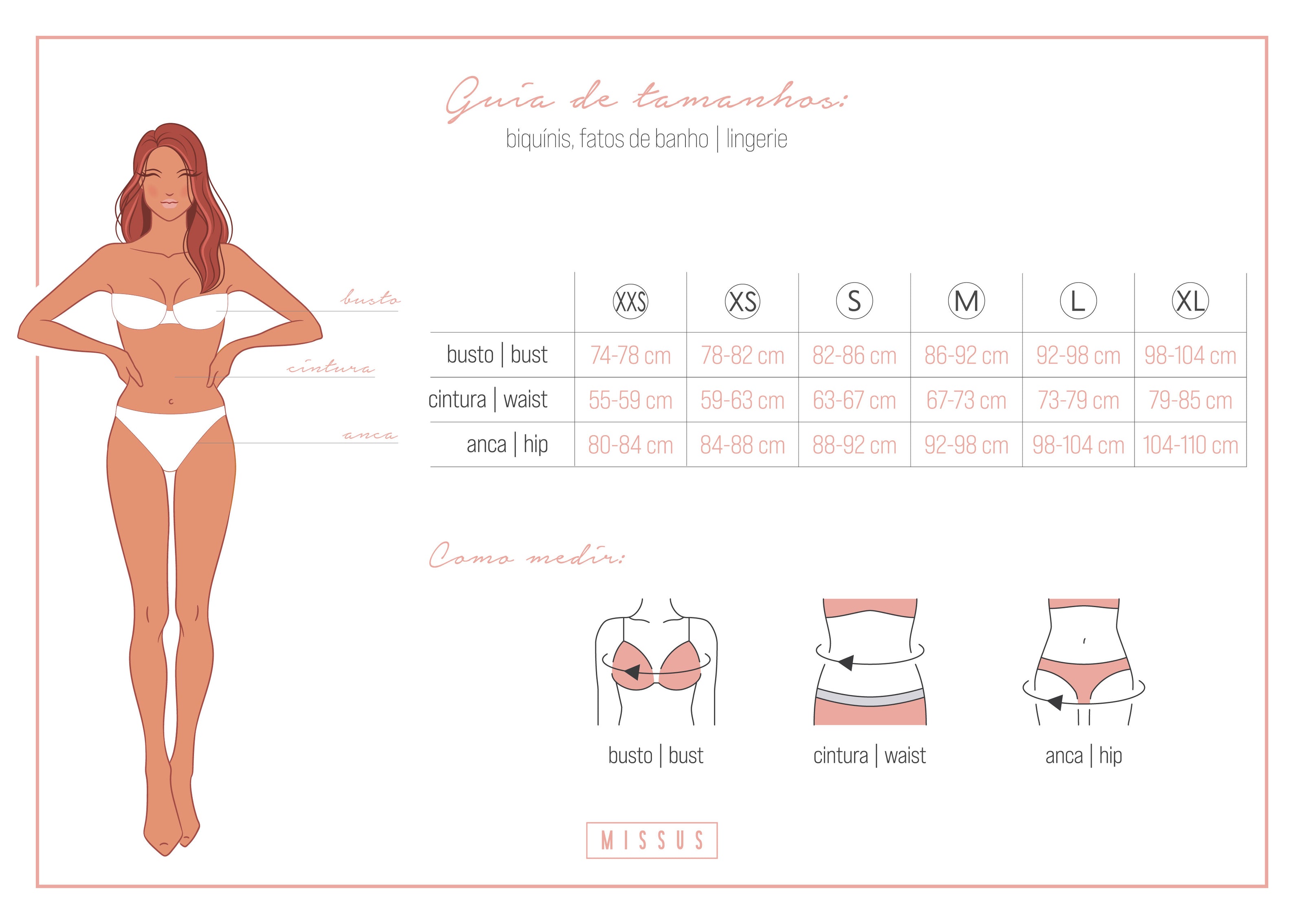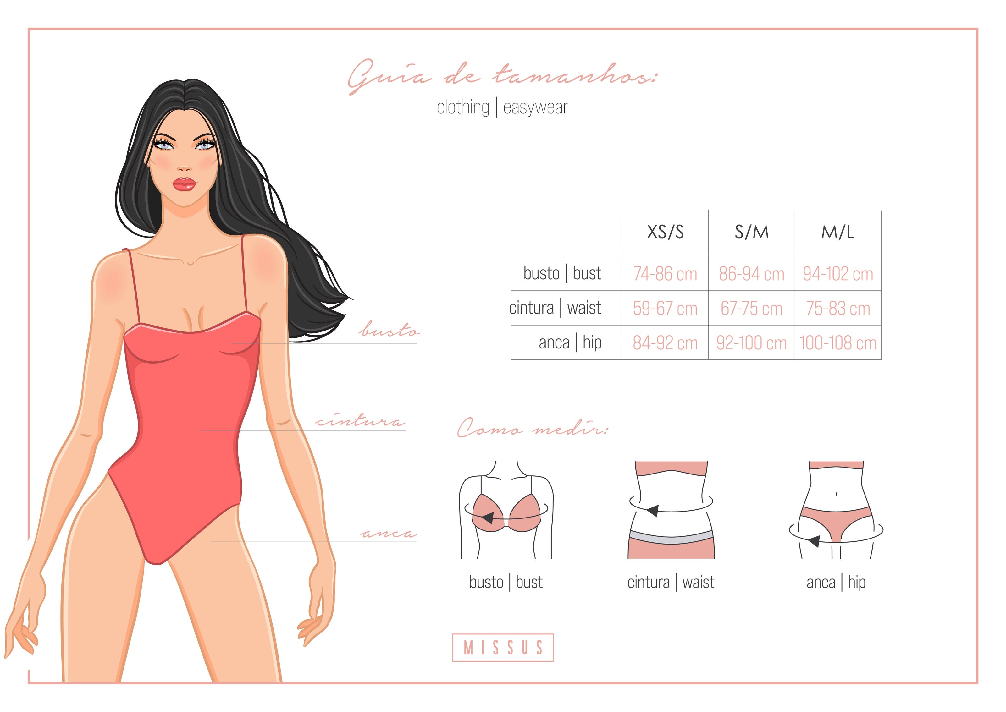 HipMeasure at the fullest part of your lower hip. The tape should fit comfortably. Please check our general size chart on the side before making your purchase. For any further information, please contact us by email at info@missus.pt or +351 916 158 854.