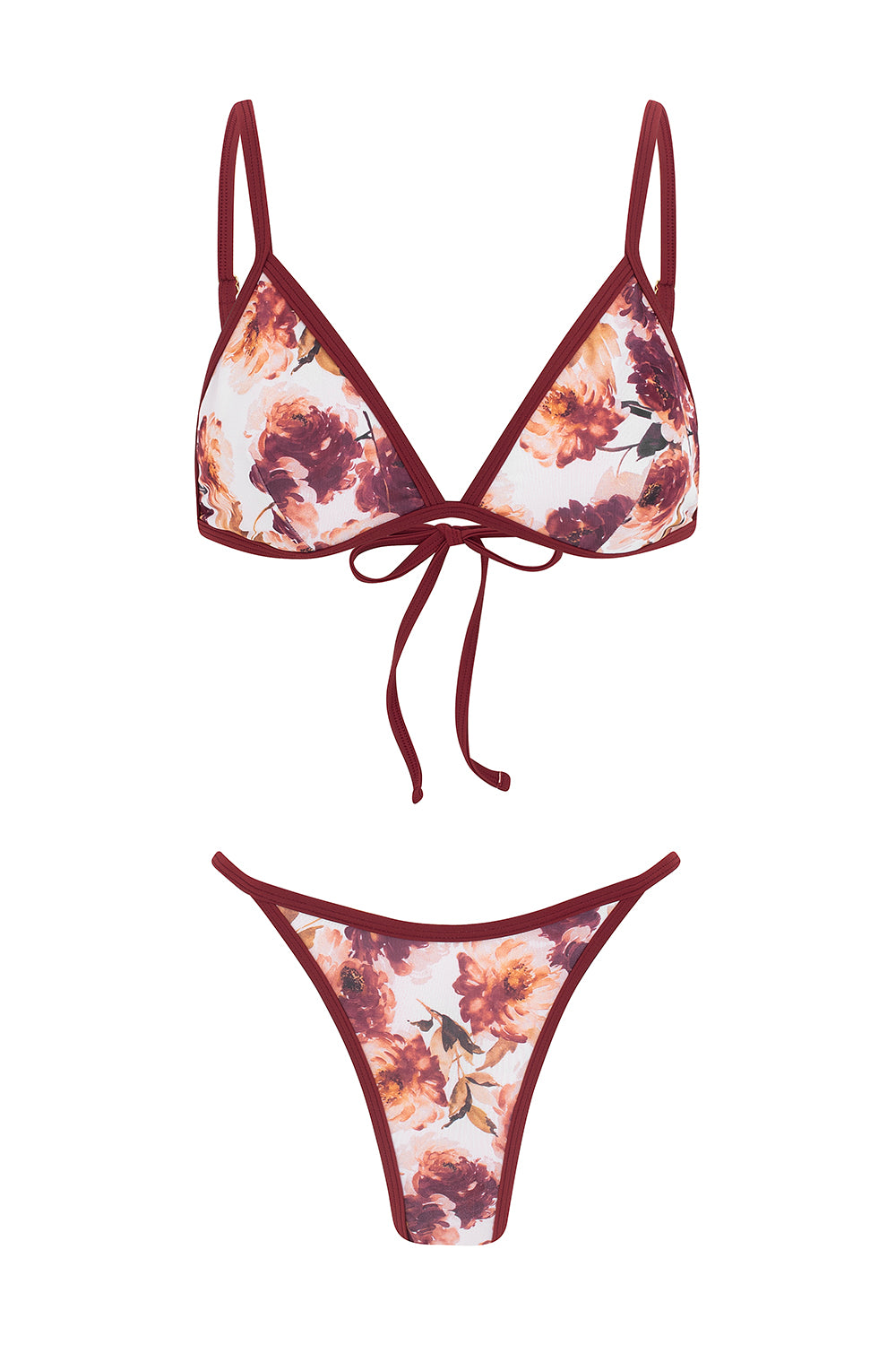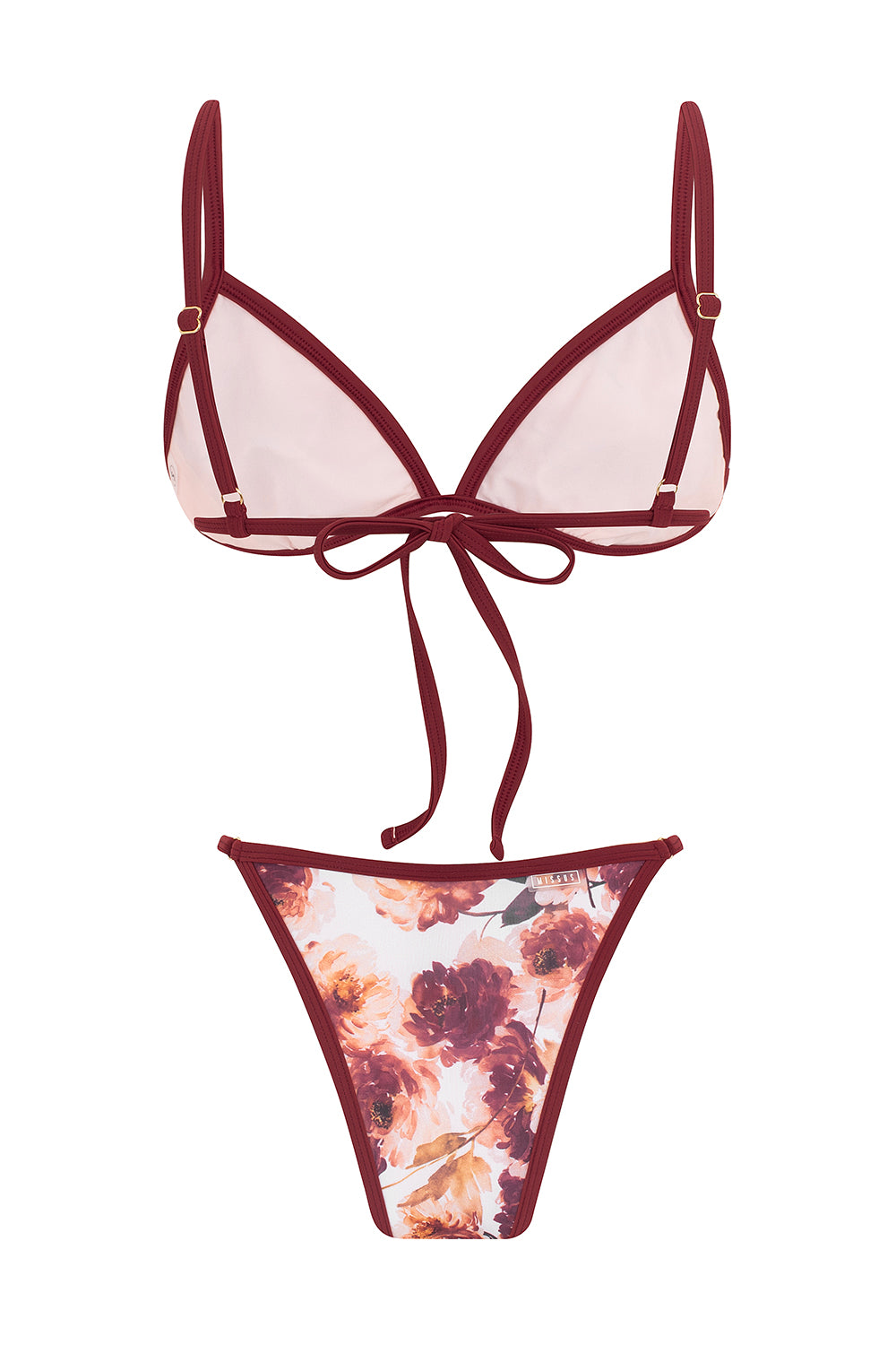 Biquíni floral bourdeaux estampado com contraste a bourdeaux. Aproveitamento de matérias primas de coleções passadas, de forma a promover a sustentabilidade.
