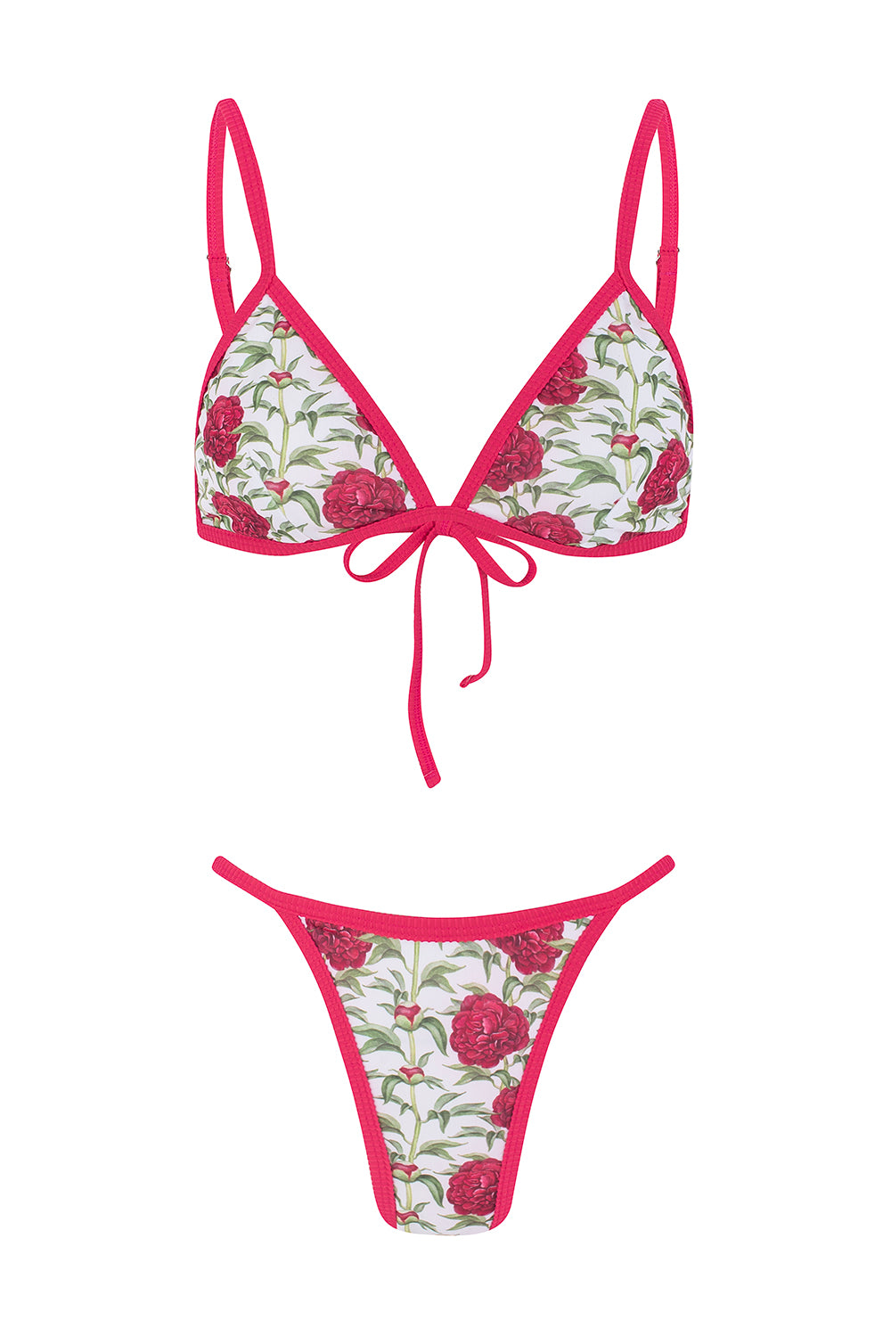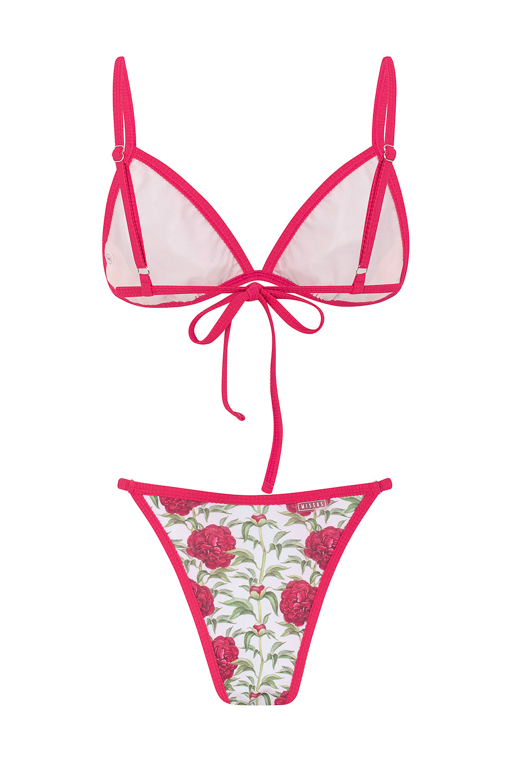 Biquíni floral vermelho estampado com contraste a vermelho texturado. Aproveitamento de matérias primas de coleções passadas, de forma a promover a sustentabilidade.