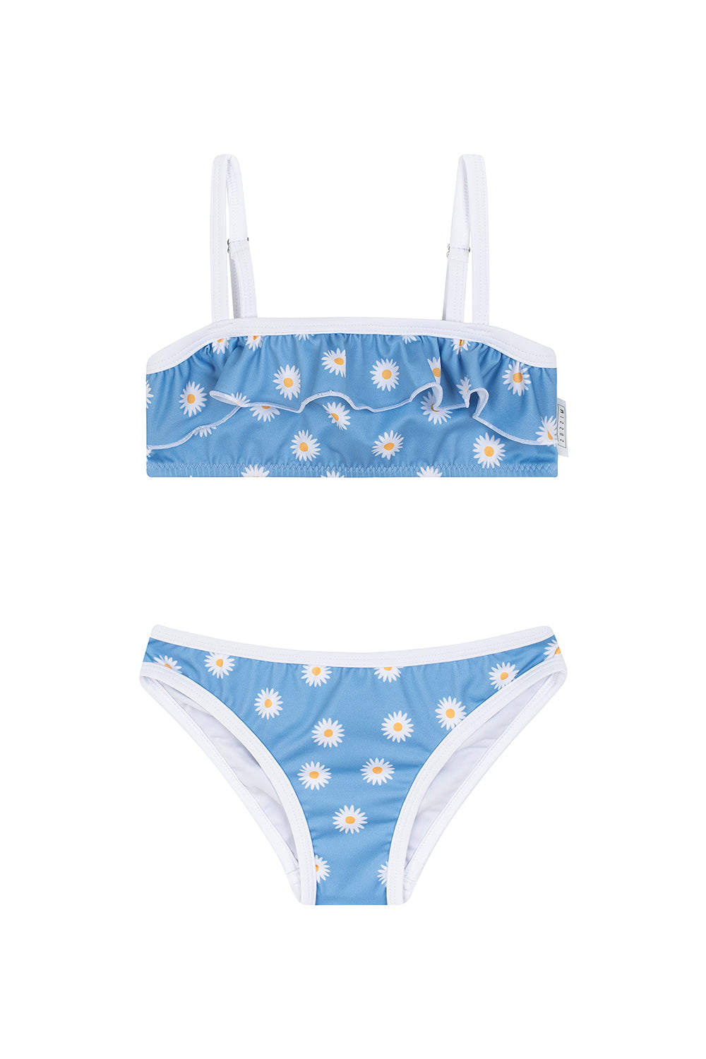 Biquíni com padrão malmequer azul e contraste branco e folho no top.