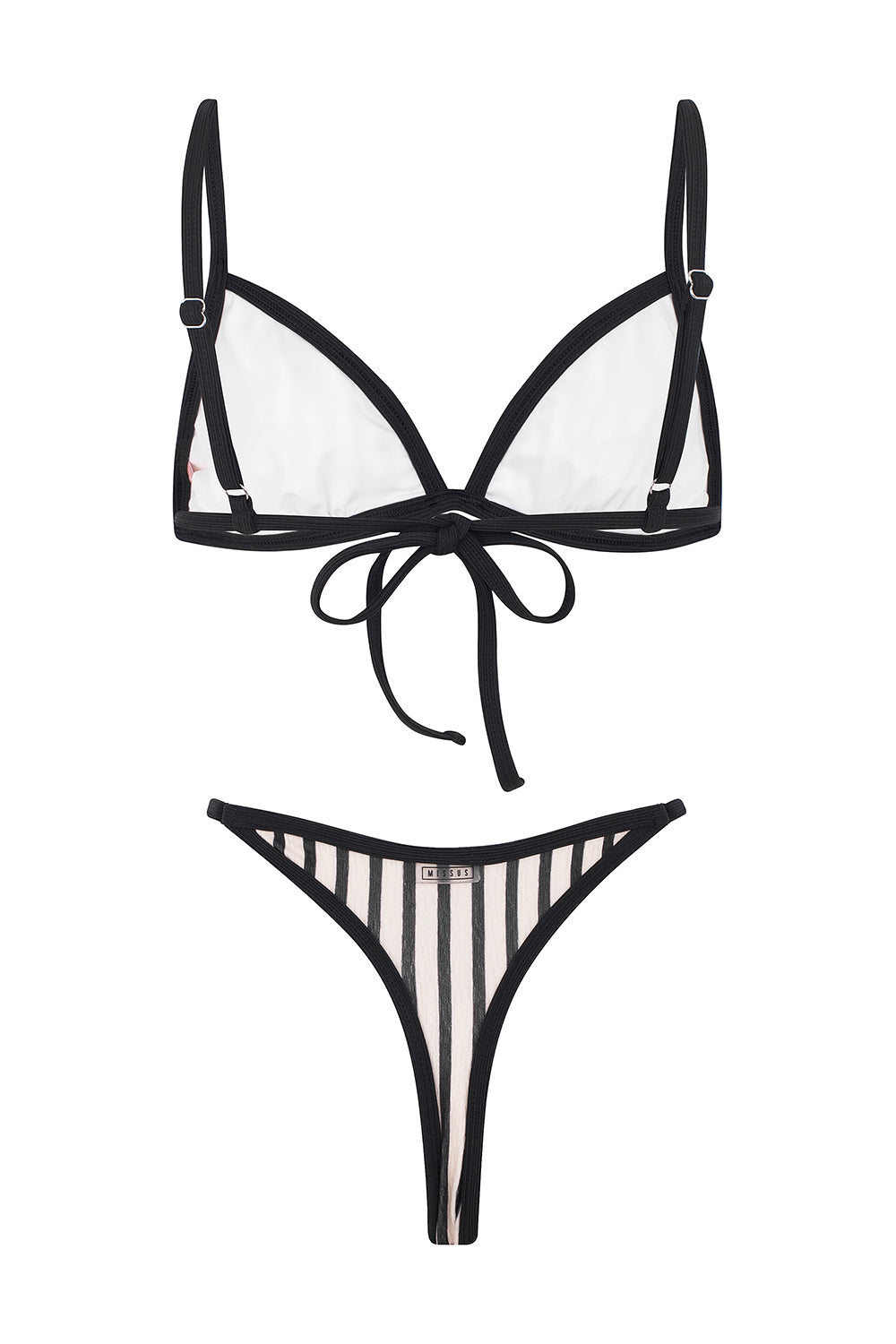 Biquíni texturado de padrão listado com contraste a preto. Aproveitamento de matérias primas de coleções passadas, de forma a promover a sustentabilidade.